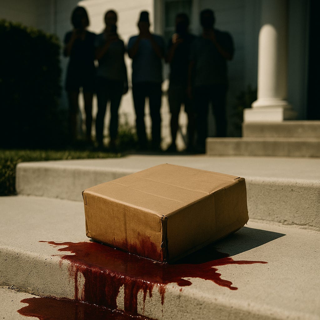 The shots came instantly, three cracks in the heat. Darrel’s body lurched backward and struck the steps with a hollow thud. His legs kicked once, then flopped apart, heels drumming the step. The parcel slid from his hand and toppled into the pool of blood spreading beneath him. The cardboard drank it up, edges curling as the tape unraveled.