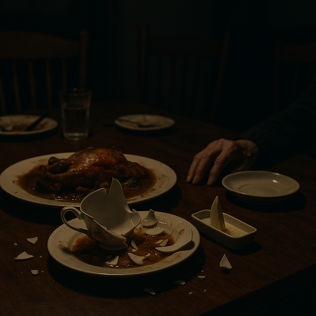 Grandma sat alone. Her hand, still lifted, trembled in the air before she set the saucer on the tablecloth. The food was cold. The gravy had skinned over. The cup shards glistened in the lamplight. The butter softened around the porcelain tooth.